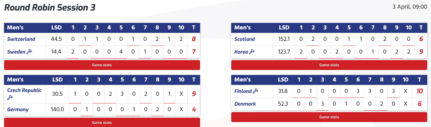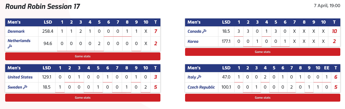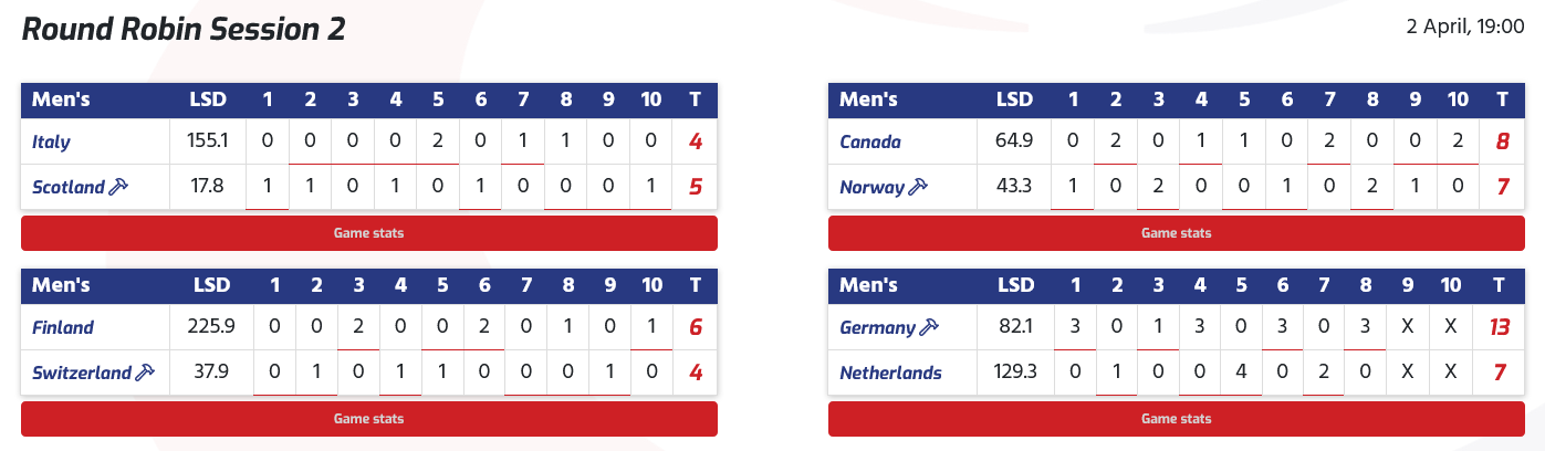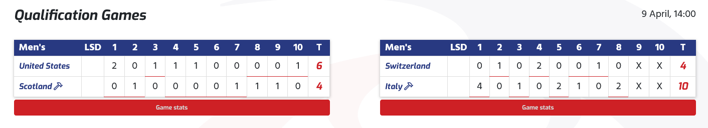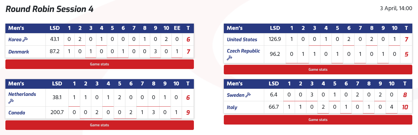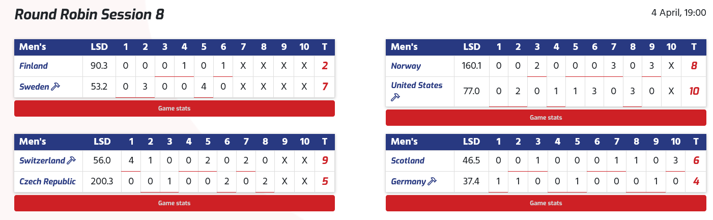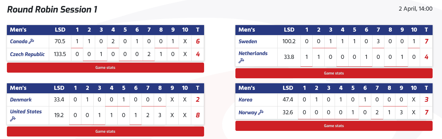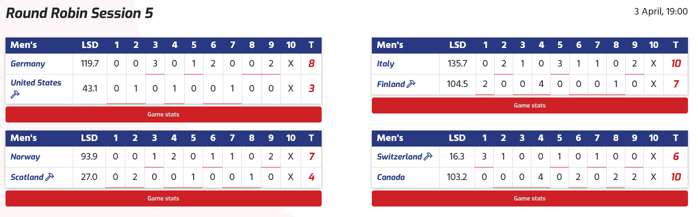 Les hôtes des États-Unis ont affronté l'Allemagne lors de cette session et, dans le troisième end, alors que les États-Unis menaient par 1-0, le capitaine allemand Sixten Totzek a joué un tap-out et a gardé sa propre pierre en position pour marquer trois points et mener 3-1 .La Suisse contre le Canada